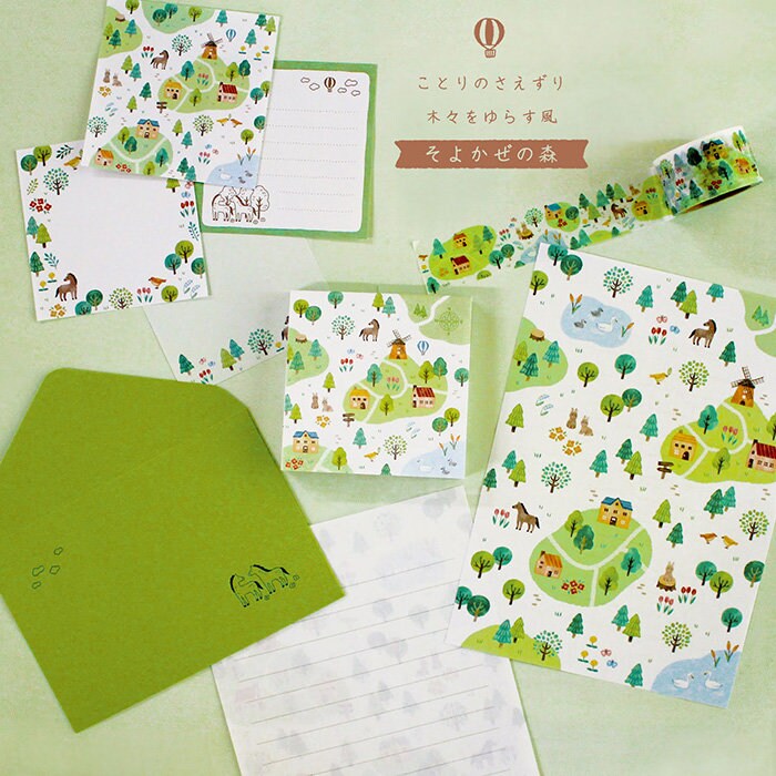 These gorgeous letter writing sets are part of the "Mori" series from Mind Wave - this particular design is named Soyokaze-no-Mori (そよかぜの森), which translates to forest breeze.