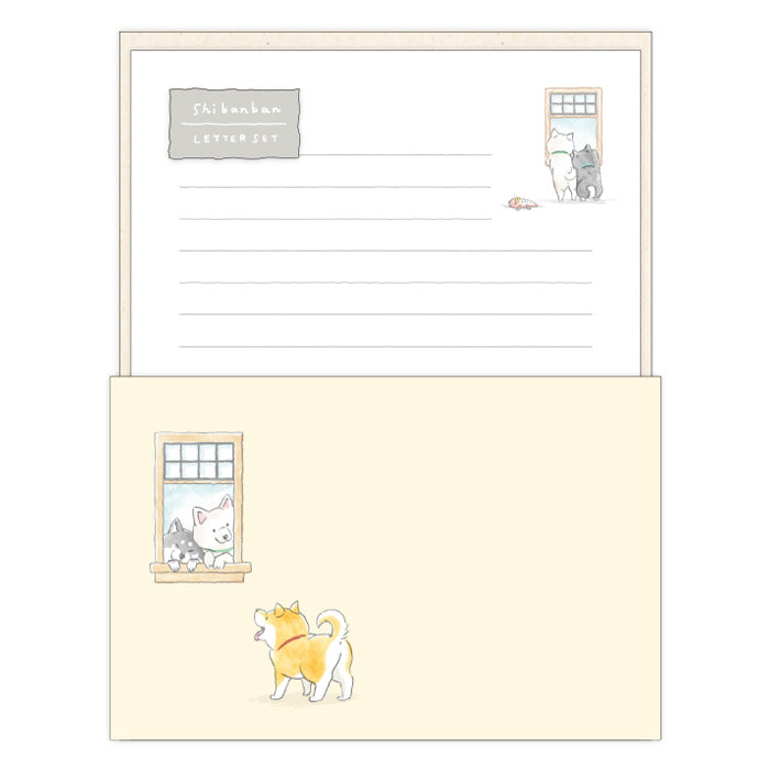 These kawaii letter writing sets are part of the "Shibanban" character series from Mind Wave - this particular design is named "Asobo" (Let's play) and features cute Shiba Inu dogs seeing friends through the window.