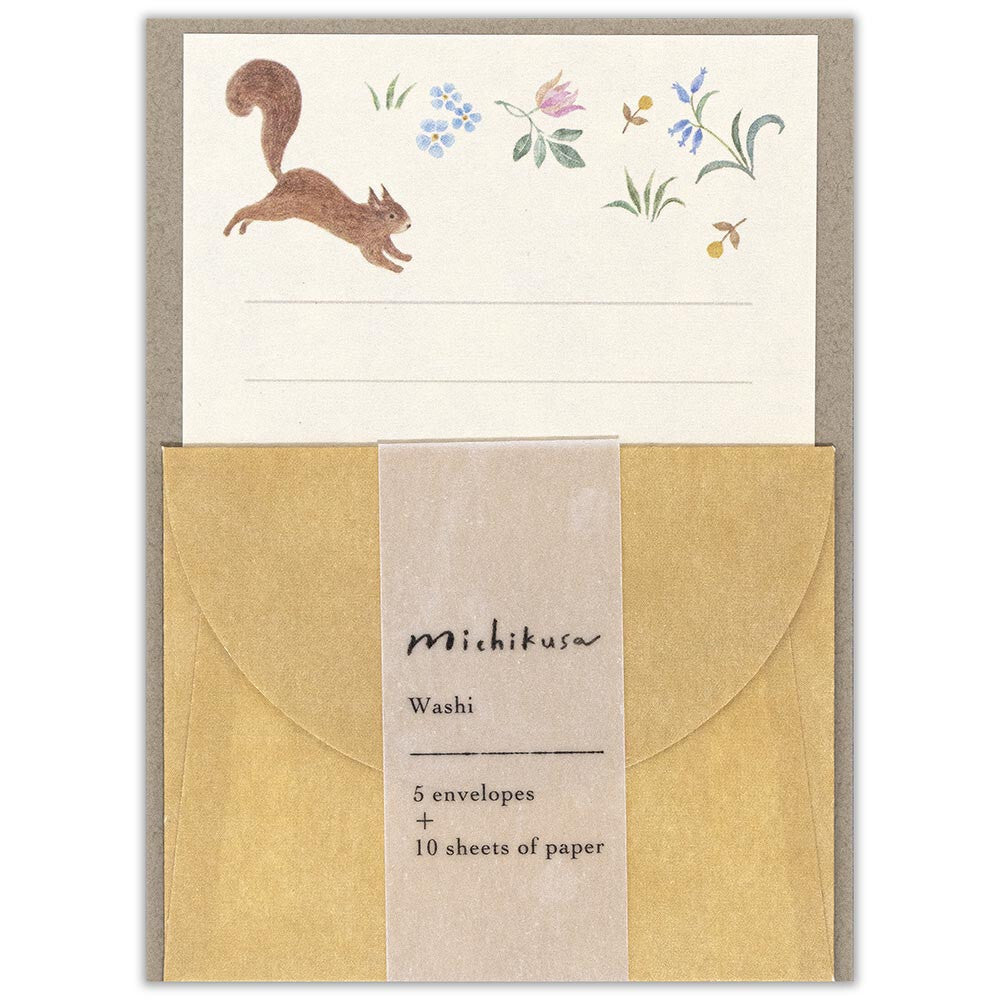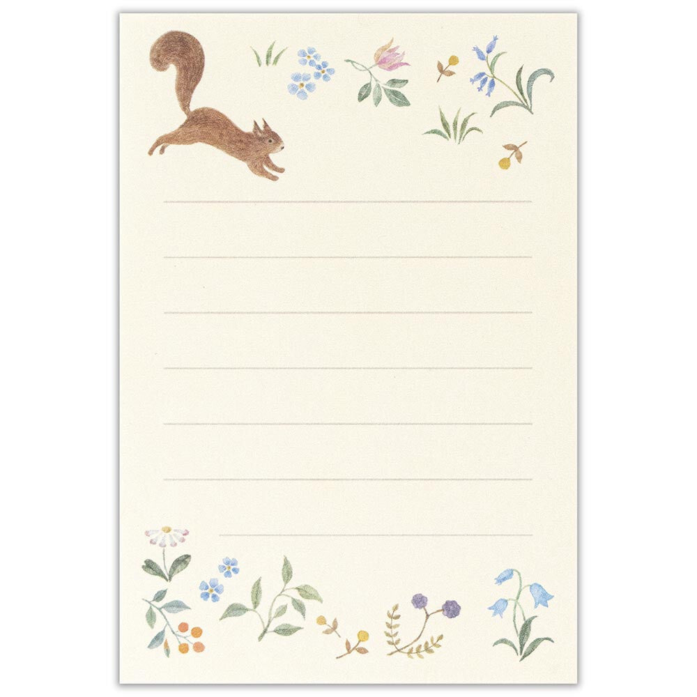 Titled "Noix" (French for "Nuts"), the letter paper features a delightful illustration, perfectly capturing the movement and joy of a squirrel searching through the flowers to find nuts. Artwork produced by Japanese artist Michikusa.