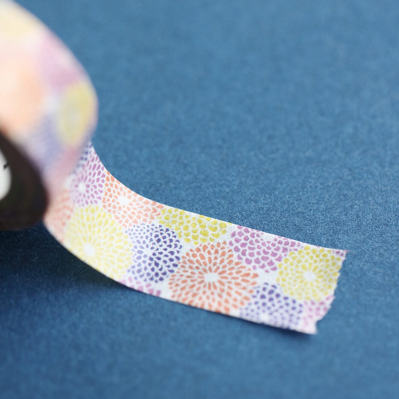 This exciting collaboration with Kyoto-based Japanese design house - SOU.SOU features gorgeous floral and abstract designs synonymous with the brand. The "Kiku Zukushi" design features white tape decorated with purple, yellow and red Chrysanthemums - a flower of great significance in Japanese culture.