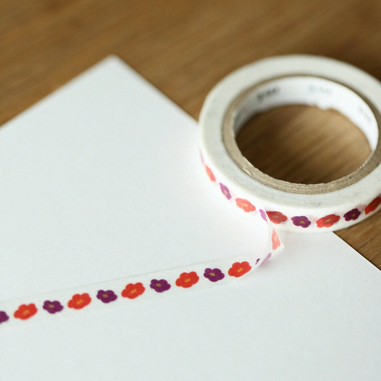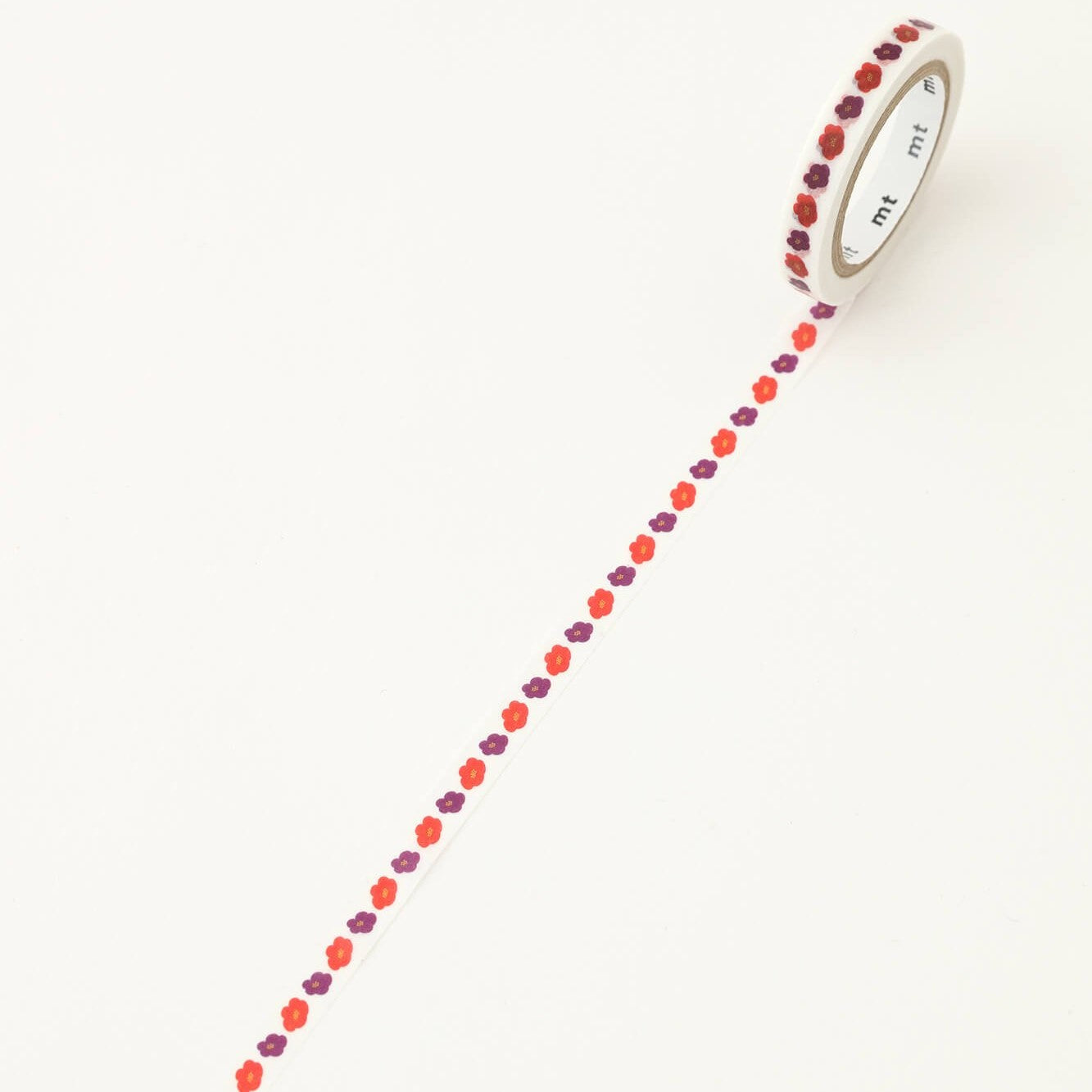 This exciting collaboration with Kyoto-based Japanese design house - SOU.SOU features gorgeous floral and abstract designs synonymous with the brand. This "Hanatsubaki" design features red and purple flowers on a white background. A narrow tape at just 7mm wide, it's ideal for decorating thinner areas such as book-edges and so on.