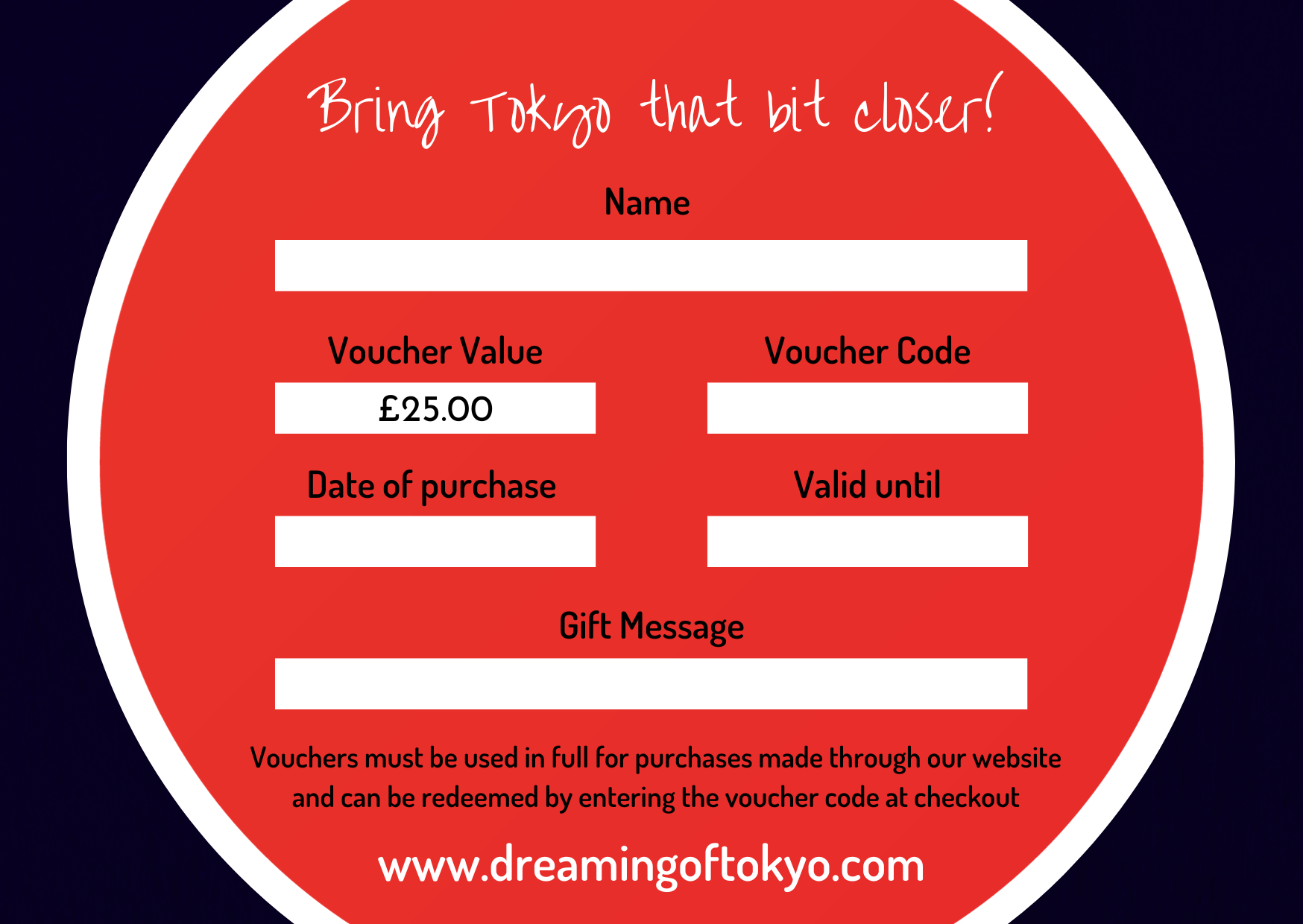 Our vouchers can be used on all products in our website store (www.dreamingoftokyo.com) and are easy to redeem by simply entering the unique voucher code at checkout.